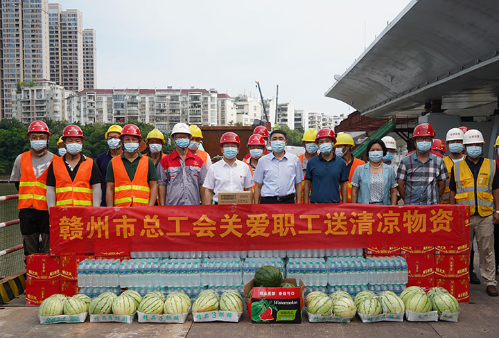 為鞏固解困脫困工作成果,提高職工生活品質(zhì),使高溫下作業(yè)的一線職工有更多的獲得感、幸福感、安全感,8月25日,贛州市總工會(huì)二級(jí)調(diào)研員賴定銘一行來(lái)到贛州城投集團(tuán)南河大橋拓寬改造(二期)工程項(xiàng)目工地開(kāi)展“關(guān)愛(ài)職工 夏送清涼”走訪慰問(wèn)活動(dòng),送上市總工會(huì)的關(guān)懷。贛州城投集團(tuán)黨委副書(shū)記黃家偉,工程管理公司相關(guān)負(fù)責(zé)人,集團(tuán)工會(huì)、文化宣傳部、項(xiàng)目部業(yè)主、監(jiān)理和施工單位相關(guān)人員等參加慰問(wèn)。