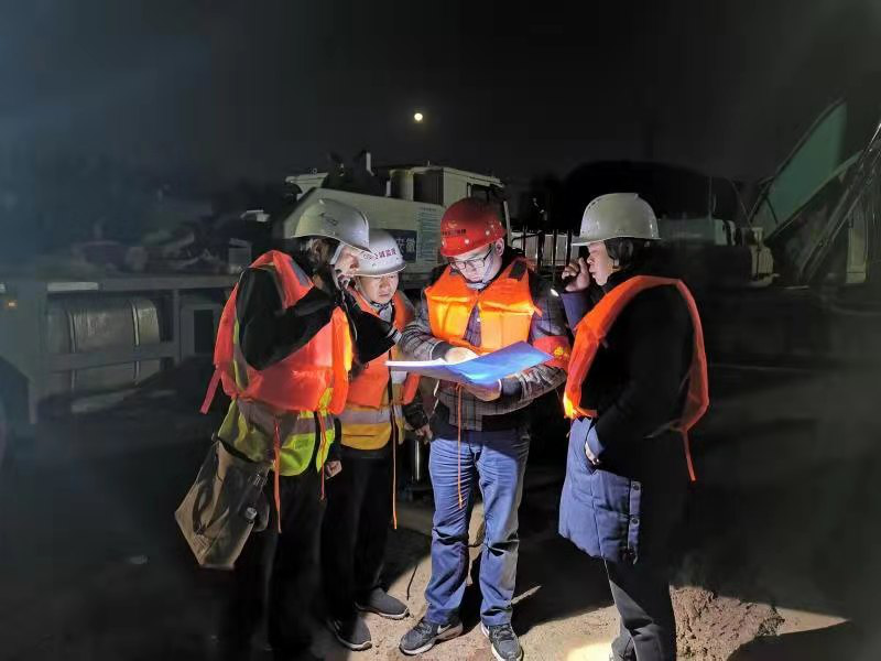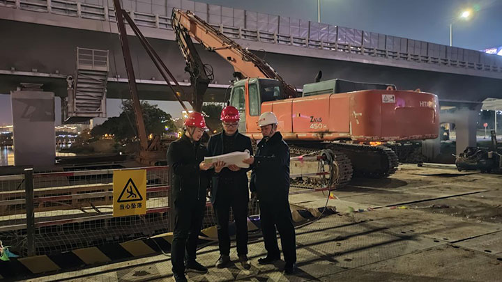 在南河大橋拓寬改造(二期)工程施工現(xiàn)場,工程管理公司工作人員組織參建人員有序推進水中墩鋼護筒下放定位、鋼平臺拆除、交叉口道路改造等施工作業(yè)。