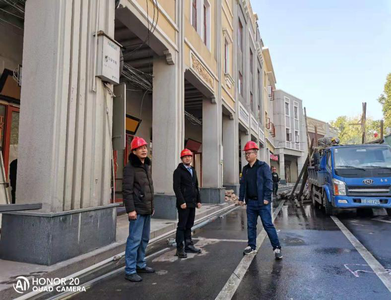 在贛南特色文化一條街項目現(xiàn)場,土地置業(yè)公司工作人員組織參建人員有序開展房屋加固修繕等工作。