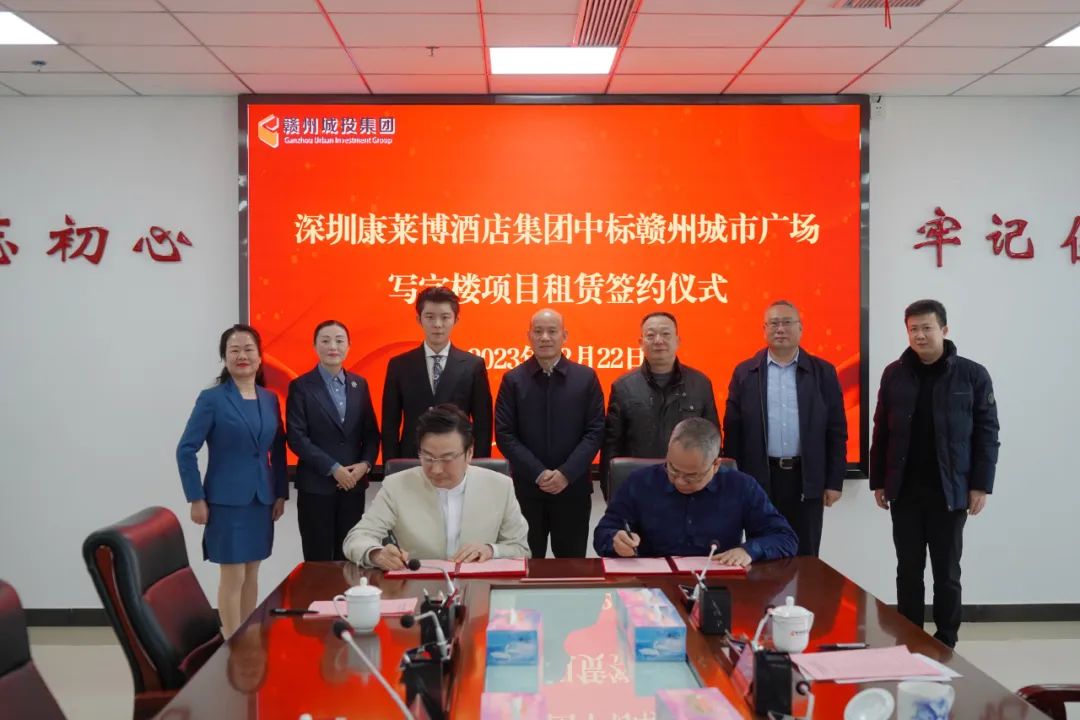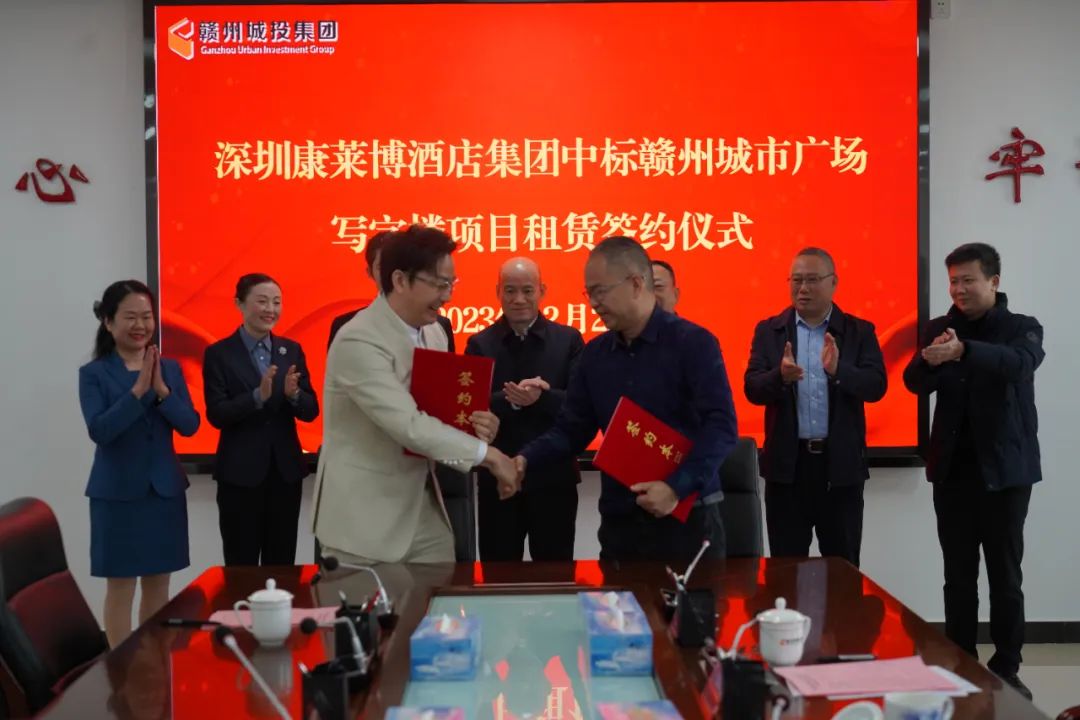 12月22日,贛州城投集團(tuán)與深圳康萊博酒店集團(tuán)舉行贛州城市廣場(chǎng)寫字樓項(xiàng)目租賃簽約儀式。贛州城投集團(tuán)黨委書記、董事長(zhǎng)劉曉方,黨委委員、副總經(jīng)理郭慶華,工會(huì)主席黃家偉以及深圳康萊博酒店集團(tuán)董事長(zhǎng)肖志堅(jiān)出席,民晟實(shí)業(yè)公司、集團(tuán)城市廣場(chǎng)招商組、深圳康萊博酒店集團(tuán)相關(guān)人員參加簽約儀式。