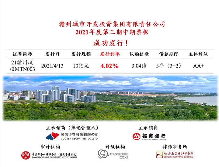 4月13日,贛州城投集團(tuán)2021年度第三期中期票據(jù)成功發(fā)行,金額10億元,發(fā)行利率4.02%/年,創(chuàng)集團(tuán)中長期債券品種利率新低,亦創(chuàng)近兩年全省同資質(zhì)同期限10億元以上公司債、企業(yè)債和協(xié)會產(chǎn)品的價格新低。同時該債券是贛州城投集團(tuán)戰(zhàn)略發(fā)展部黨支部全體黨員黨史學(xué)習(xí)教育成果與業(yè)務(wù)成果的有力轉(zhuǎn)化。