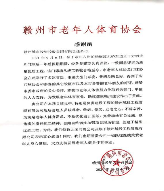 近日,贛州市老年人體育協(xié)會(huì)向贛州城投集團(tuán)送來(lái)了一封感謝信,信中對(duì)贛州城投集團(tuán)及下屬工程管理公司關(guān)心關(guān)愛(ài)老年人身體健康,大力支持老年人健身體育事業(yè)表示感謝。