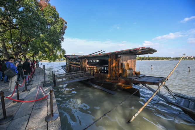 到新中國成立時,一大代表們當年乘坐的畫舫已難覓蹤跡。1959年,南湖革命紀念館開始籌建,在多方考證和細致還原后,送往北京的船模得到了認可。經(jīng)過緊張施工,“中共一大紀念船”在藍天秀水間重現(xiàn)。1964年,一大代表董必武重來南湖,登船時感慨萬千,賦詩曰:“革命聲傳畫舫中,誕生共黨慶工農(nóng)。重來正值清明節(jié),煙雨迷濛訪舊蹤。”