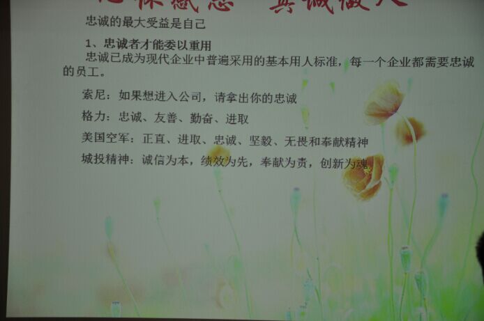 我們城投精神的16字方針:誠信為本,績效為先,奉獻為責,創(chuàng)新為魂。誠信其中一個表現(xiàn)就是忠誠。